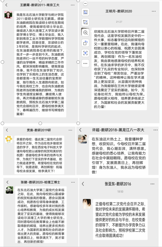 在研究生培养方面,近三年有近20%的研究生考上了兰州大学、东北大学、西安电子科技大学、南京农业大学、哈尔滨理工大学、beat365平台官方网站等知名高校的博士研究生。已经毕业的研究生有多名扎根在黑龙江省各基层单位为龙江经济建设贡献自己的青春和热血,也有奋斗在南京工业大学、上海工程技术大学、黑龙江八一农垦大学、大庆师范学院等高校和大庆市团委、大庆市各中学等单位,扎根在教育第一线为祖国培育建设者和接班人,他们一直在努力践行大庆精神铁人精神,用实际行动诠释“身在最北方,心向党中央”,将自己的青春邵华奉献给龙江的发展建设。悉知学校即将召开第二届党代会,他们纷纷送上了真诚的祝福。